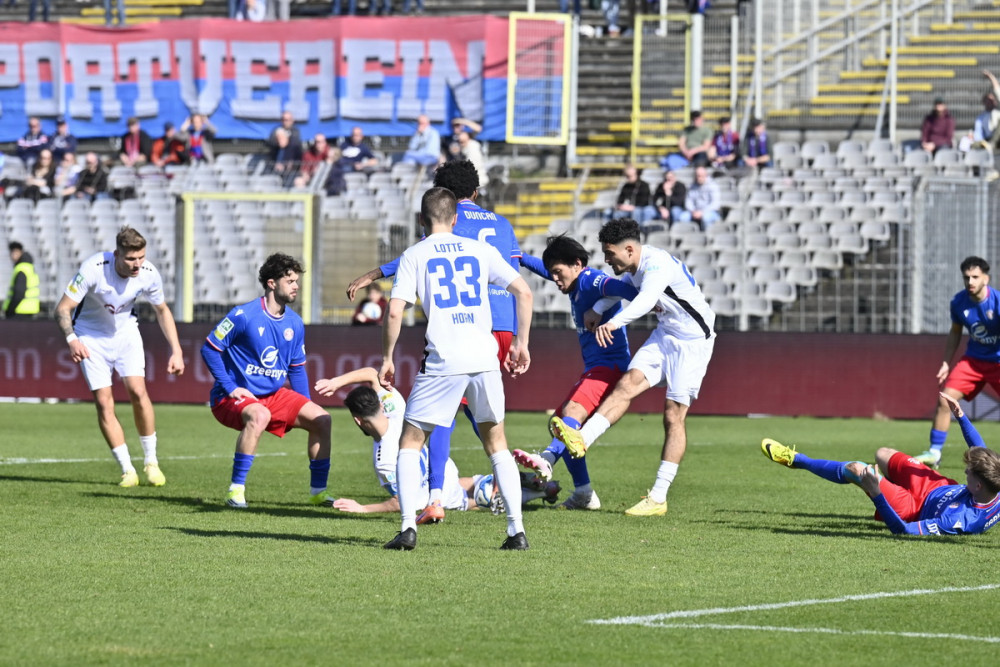 90.+4. Minute: Der WSV mit Mann und Maus im eigenen Strafraum, wenigstens nicht verlieren. Doch mit zwei Mann weniger kostet das Kraft.